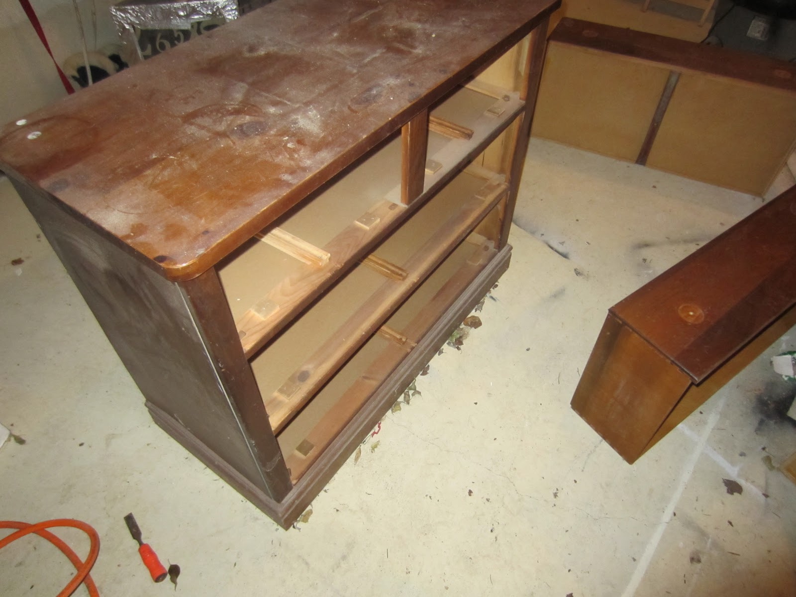 I planned to make a burlap knot cloth to cover up the opening of the console. Then I remembered that I had picked up a wood dresser last summer for $5 at a tag sale.