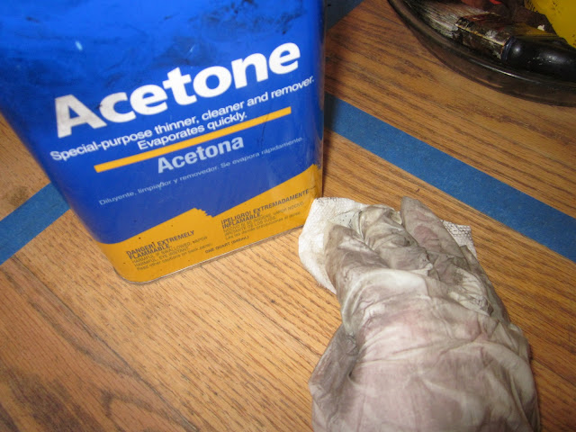 Once the floor was striped I used acetone to wipe the area after the sanding and vacuuming.