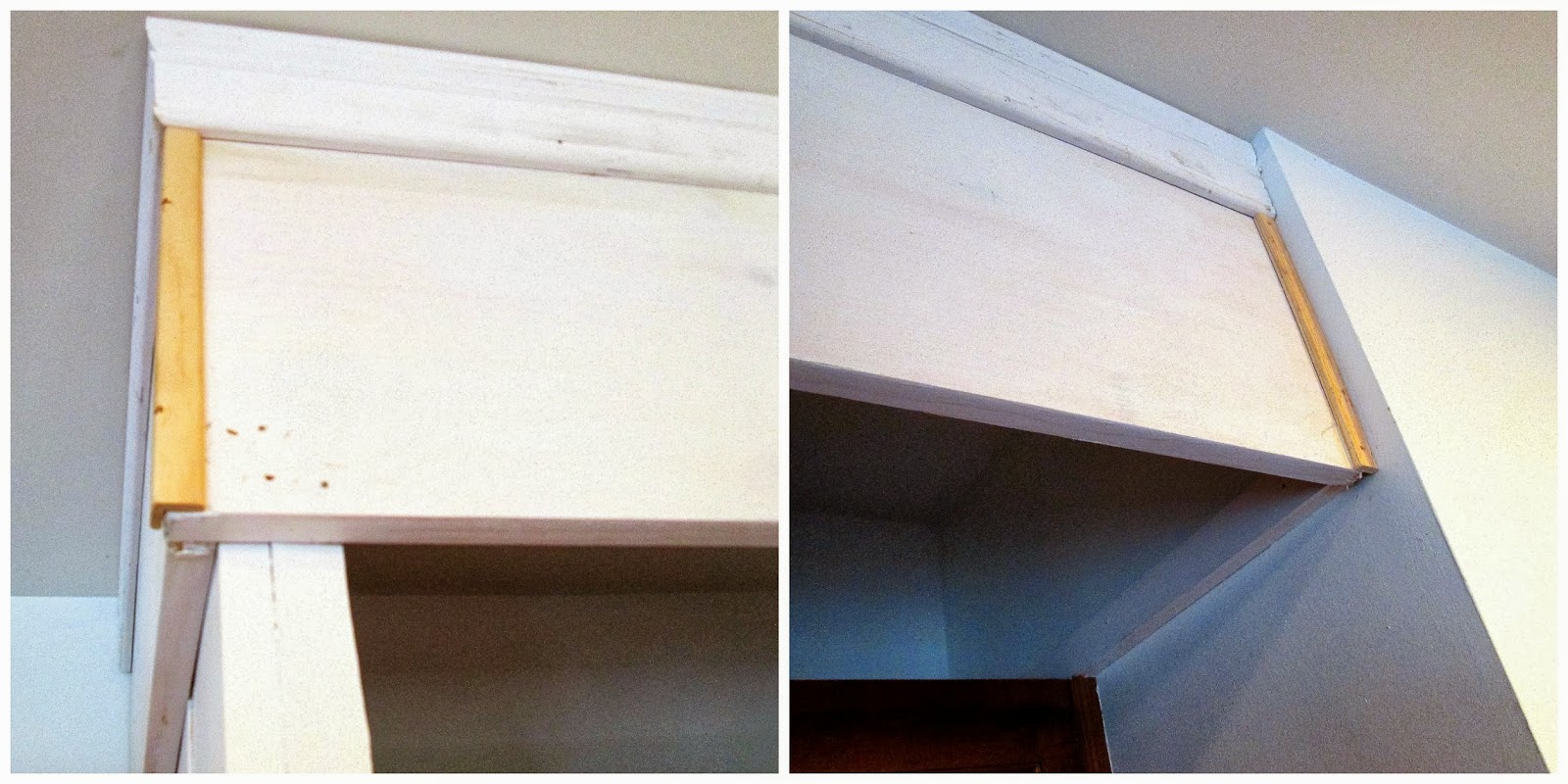 A thin birch wood panel that is painted white just sits in front of the existing cabinets. I added a shelf to lay on the support beam on the wall and created another support beam on the inside of the homemade panel so that it will enclose the top.